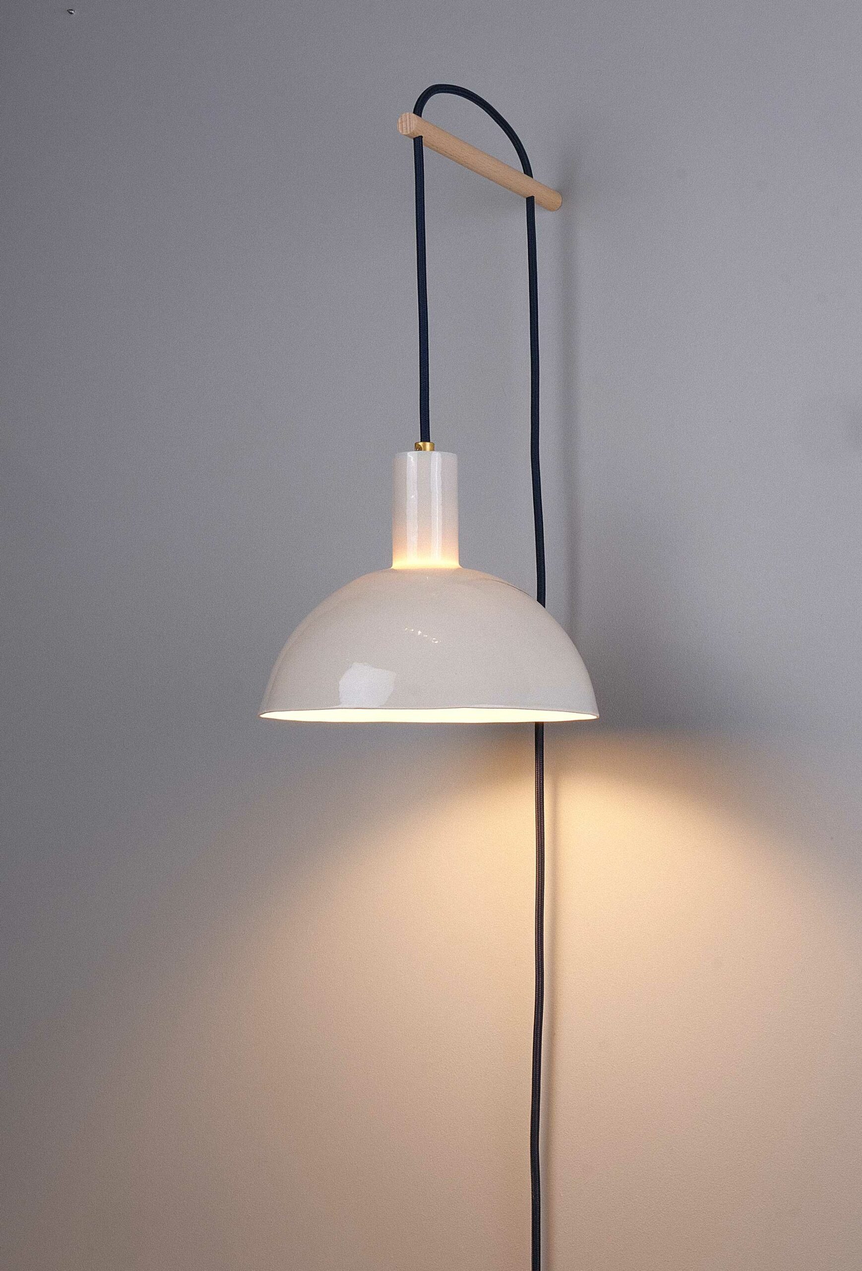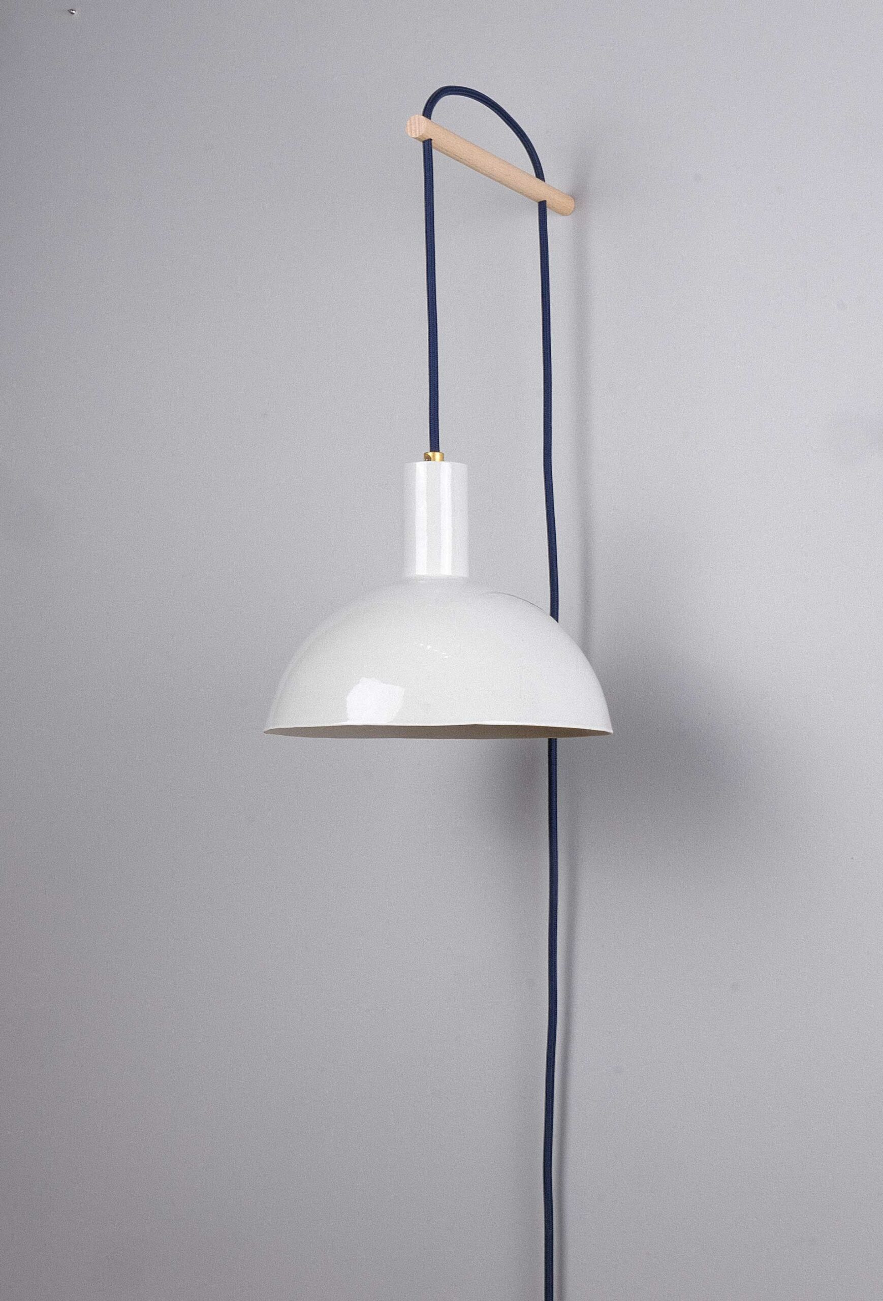 22 x 18 cm. Moulée à la main. Porcelaine cuite à haute température (1250°). Émaillage extérieur : brillant transparent. Accroche murale en bois. Serre-câble en laiton. Interrupteur et prise en plastique transparent. Soquet E14. Fil tissé : 300 cm, couleur au choix.