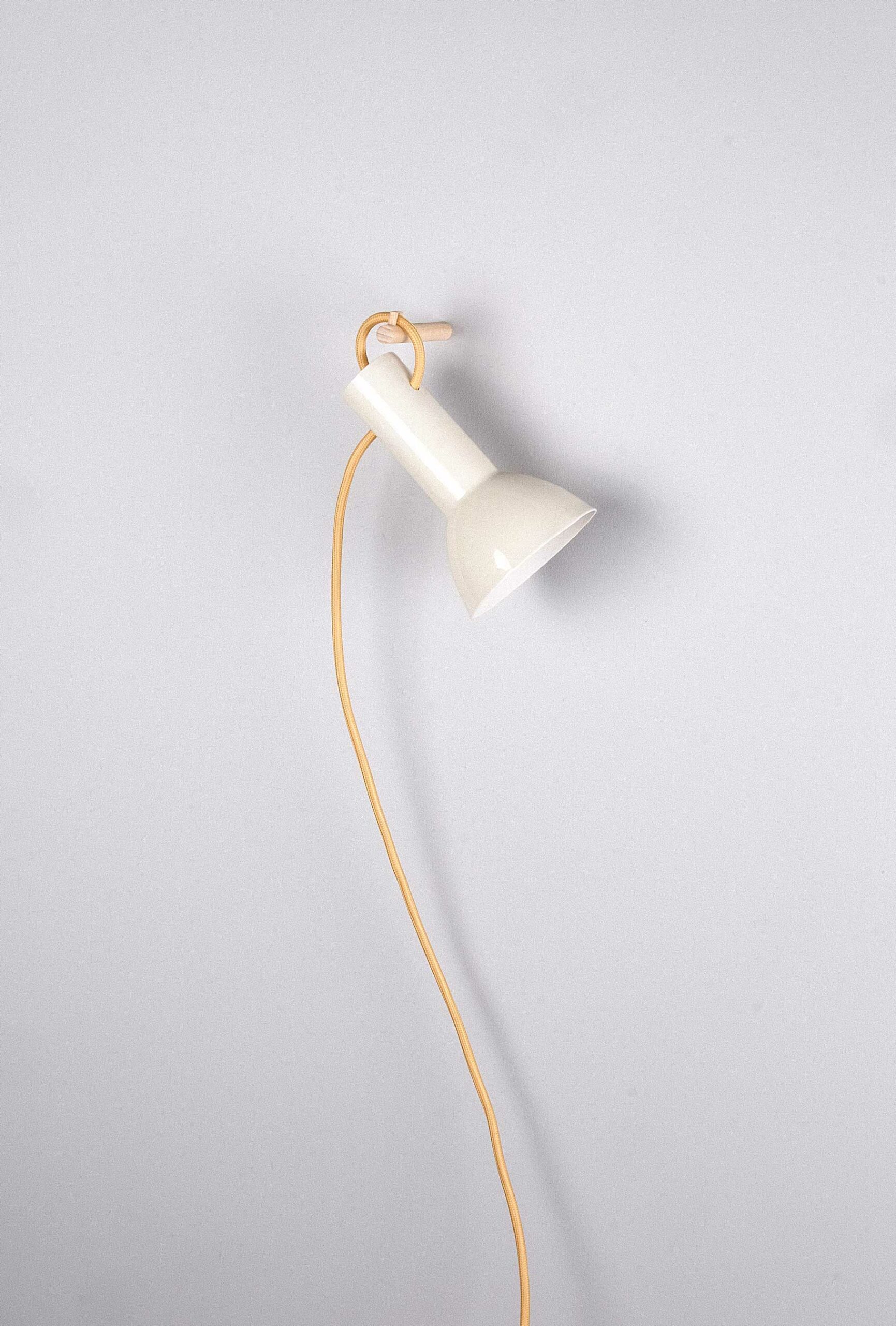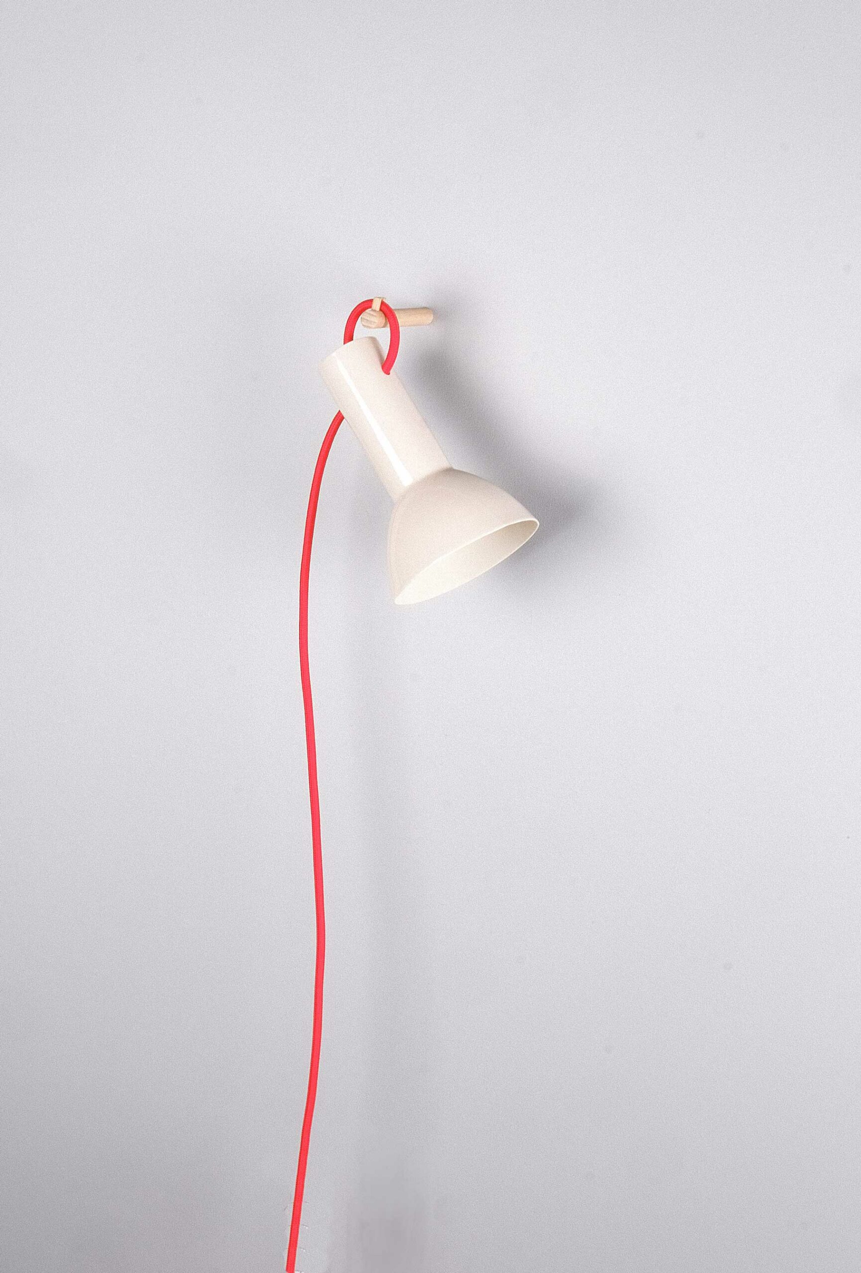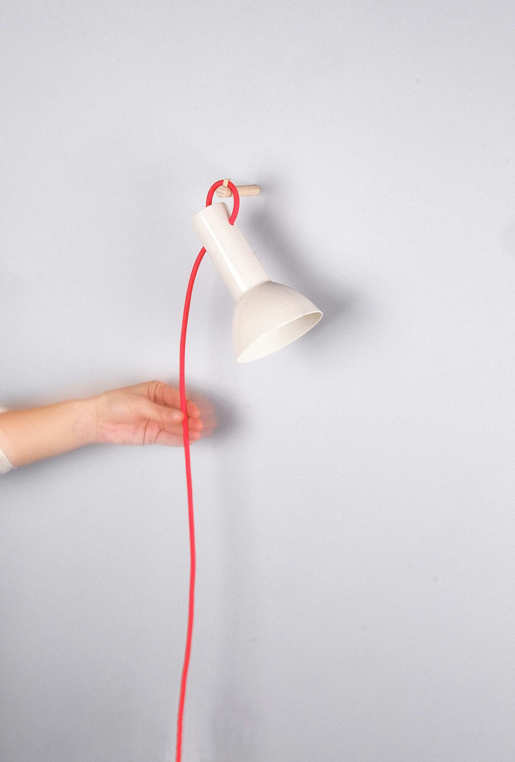 10 x 16 cm. Moulée à la main. Porcelaine cuite à haute température (1250°). Émaillage extérieur : brillant transparent. Accroche murale en bois. Interrupteur et prise en plastique transparent. Soquet E14. Fil tissé : 220 cm, couleur au choix.