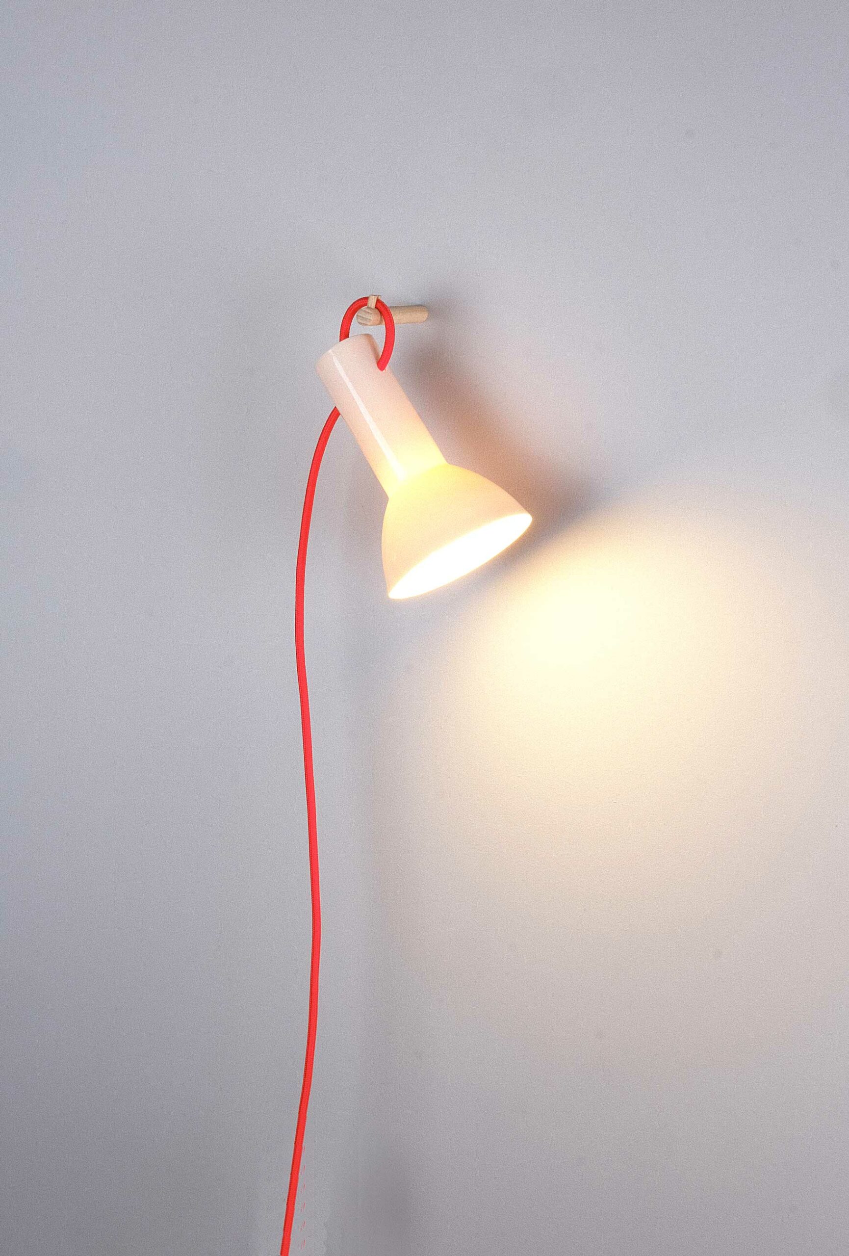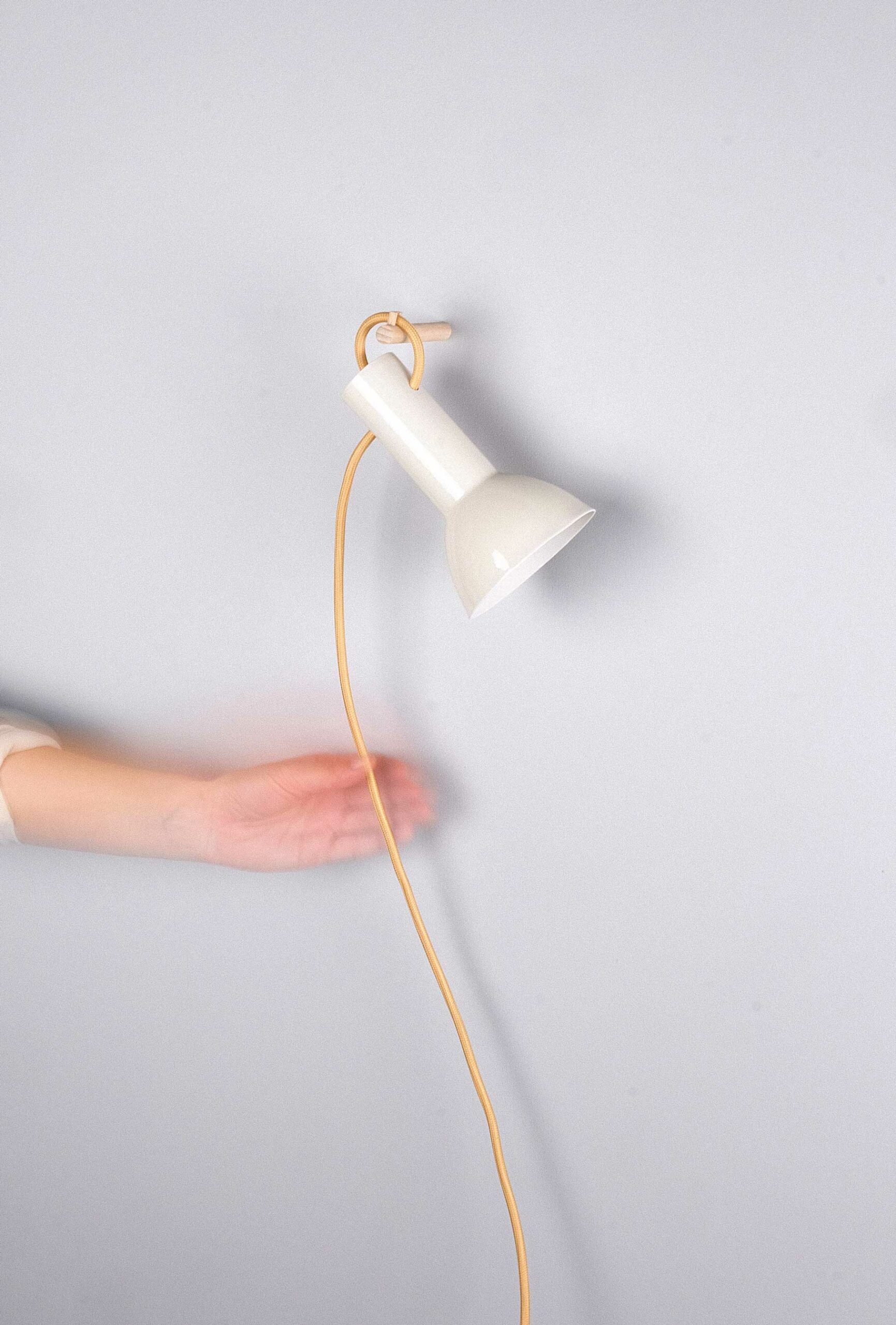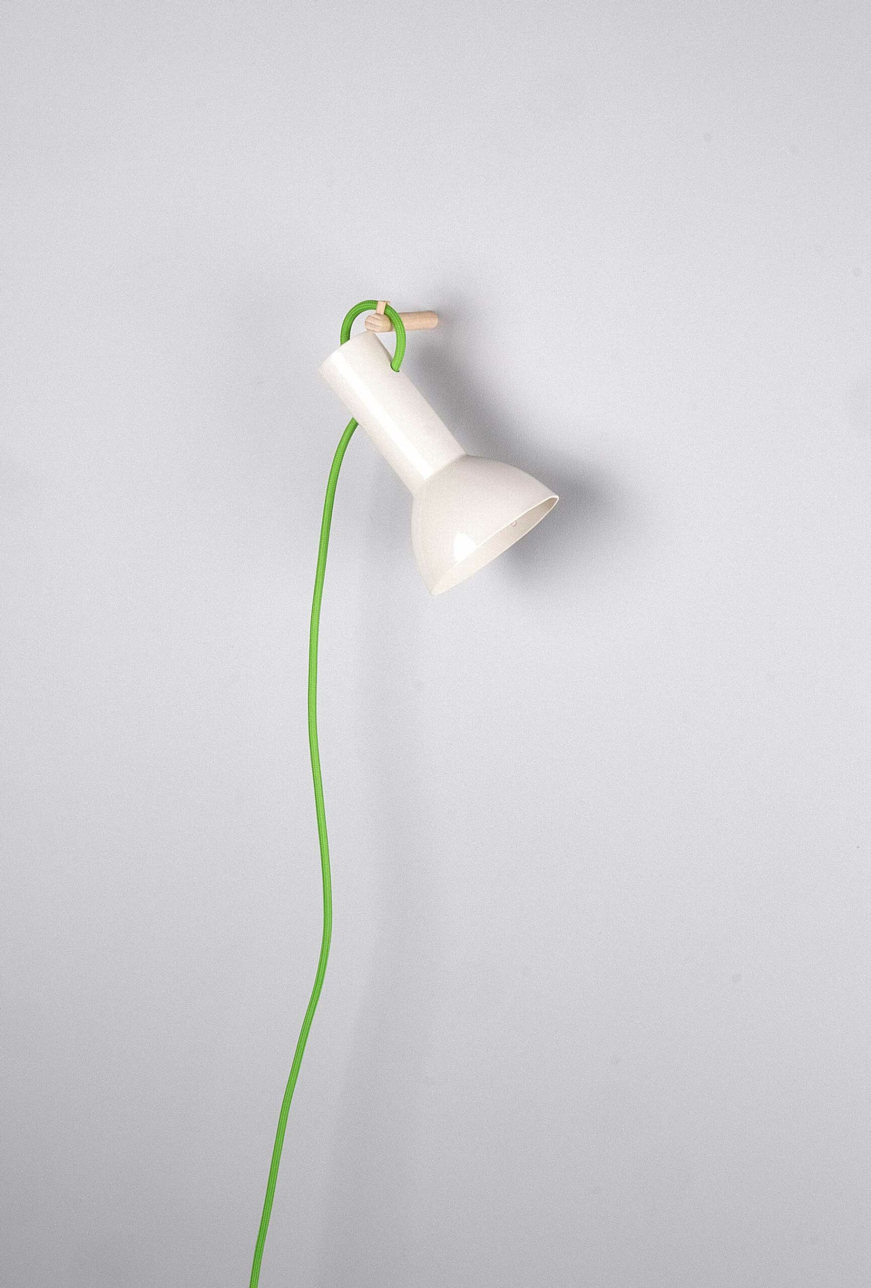 10 x 16 cm. Moulée à la main. Porcelaine cuite à haute température (1250°). Émaillage extérieur : brillant transparent. Accroche murale en bois. Interrupteur et prise en plastique transparent. Soquet E14. Fil tissé : 220 cm, couleur au choix.