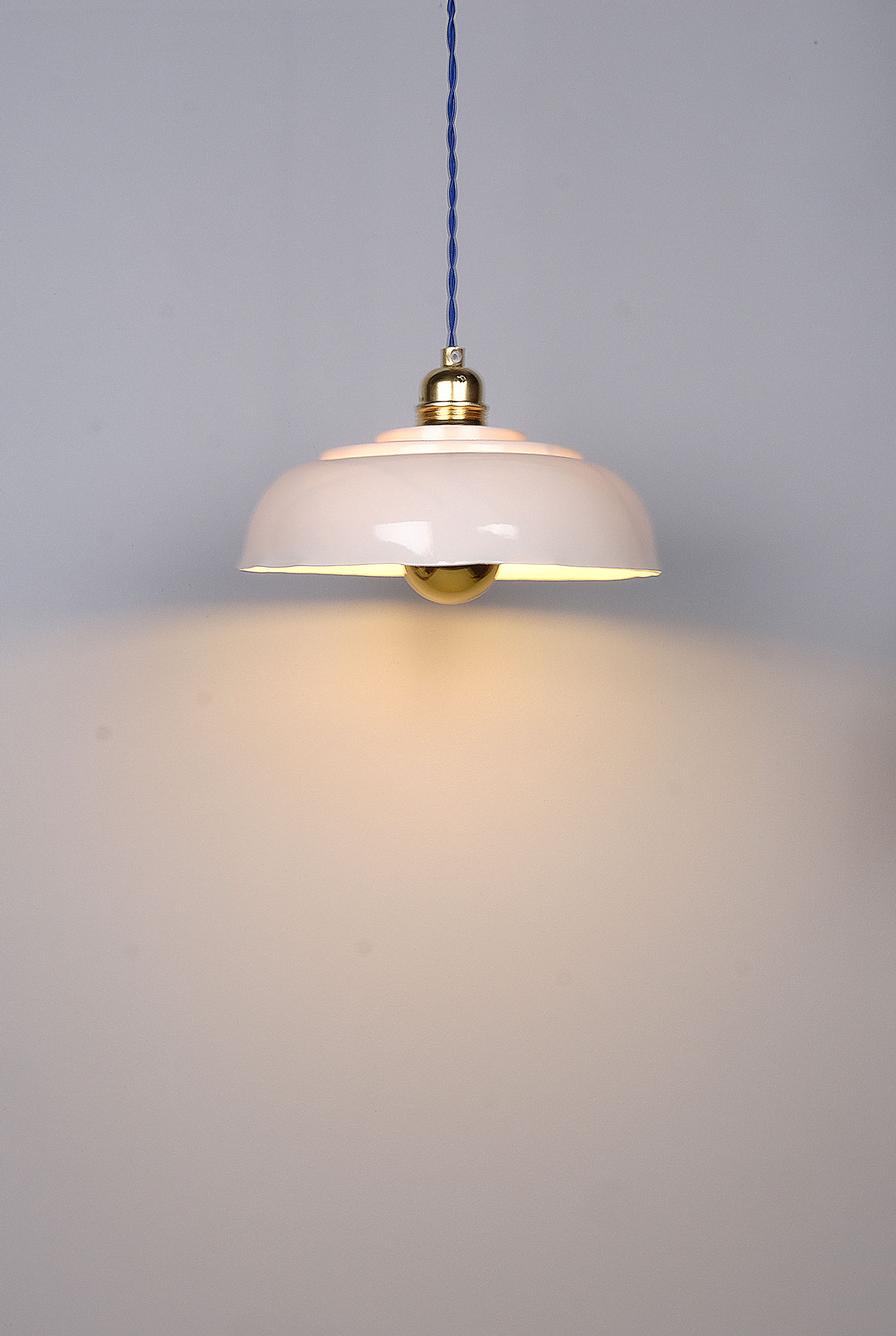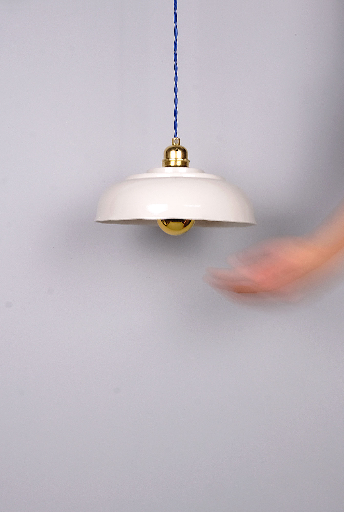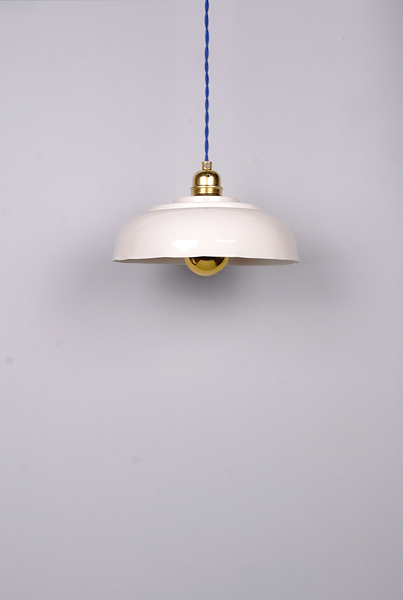 27 x 18 cm. Moulée à la main. Porcelaine cuite à haute température (1250°). Émaillage extérieur : brillant transparent. Serre-câble en laiton. Soquet E27. Vendue avec cache fil pour plafonnier. Fil torsadé : 300 cm, couleur au choix.